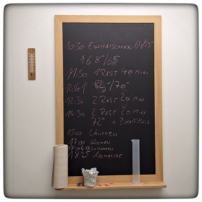 Diesmal wollten wir uns auf das digitale Thermometer verlassen. Das schien uns vertrauenswürdiger... und hat uns im Stich gelassen. Bei 72° haben wir aufgehört zu heizen. Noch mal das Thermometer in die Maische halten, 72°, alles gut jetzt... und plötzlich macht die Anzeige einen Sprung auf 76°.