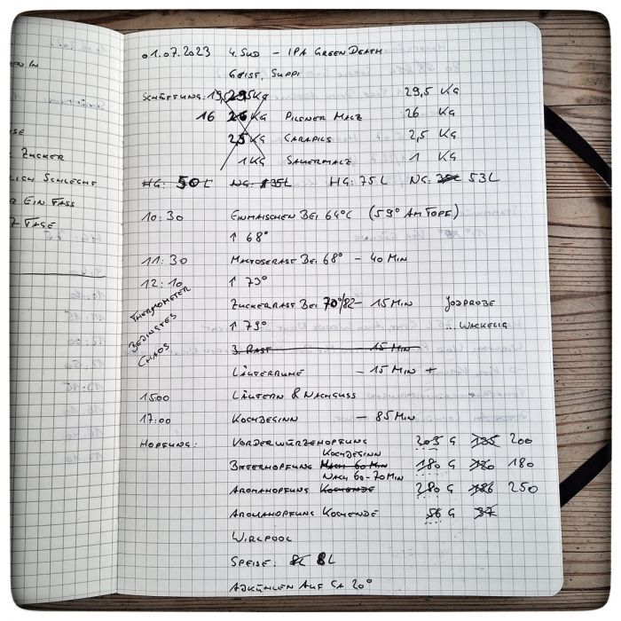 Jetzt schnell reagieren. 25 Liter Wasser ablassen und das Rezept in Windeseile von 75 auf 50 Liter umrechnen. Eine Ahnung vom Dreisatz haben hilft. Das Malz, den Hopfen, Speise... wir arbeiten ja noch mit Bleistift und Papier. Nix Excel. Da ist noch richtig Rechnen angesagt. Ok, mit dem Taschenrechner, nicht mit dem Kopf. So viel Faulheit muss sein.