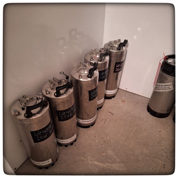 Erst mal die Fässer vom letzten Sud in die Kühlung räumen. Das Weißbier mag es schließlich kühl und der Brauer hat es gerne, wenn er Platz im Sudhaus hat.