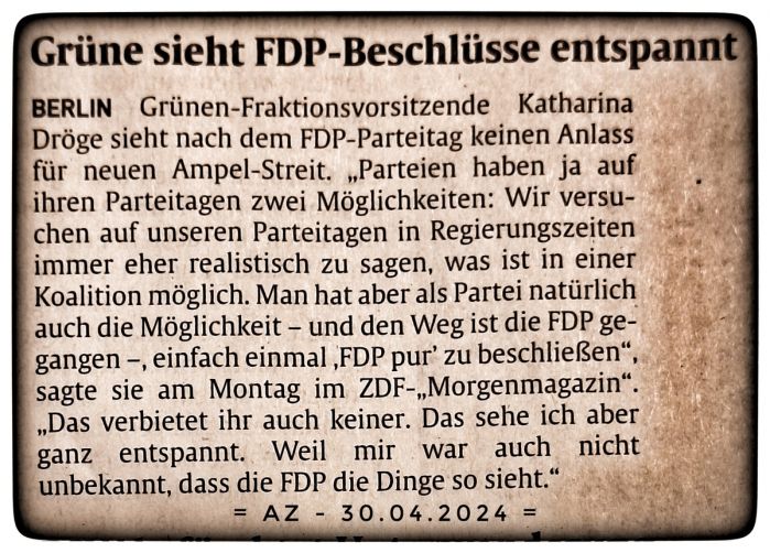 Noch weit begrüßenswerter wäre es, wenn der Koalitionspartner Konsequenzen zöge und sagte, mit einer FDP können wir nicht. Wir können nicht mit einer unsozialen Partei. Nicht mit einer Partei, der die Umwelt egal ist. Und nicht mit einer Partei, die Steuergelder in die Wirtschaft pumpt.