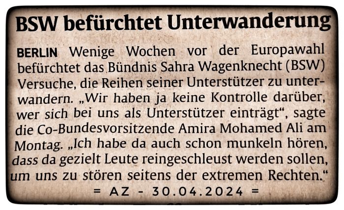 Das Bündnis Sahra Wagenknecht befürchtet also eine Unterwanderung. Vornehmlich von rechts. Fast möchte man Sahra, Amira - und wer sonst noch furchterfüllt in die Zukunft blickt - in den Arm nehmen, den Kopf streicheln und beruhigend zureden: