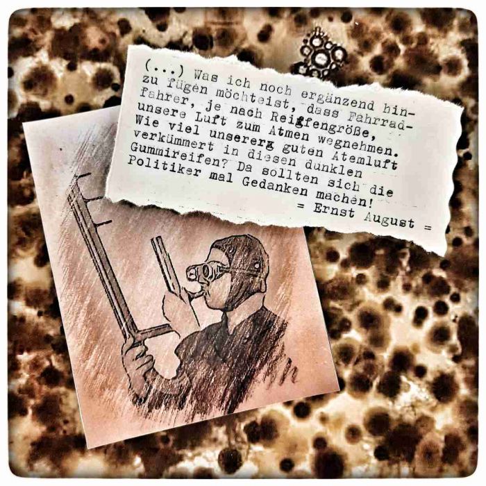 (...) was ich noch ergänzend hinzufügen möchte ist, dass Fahrradfahrer, je nach Reifengröße, unsere Luft zum Atmen wegnehmen. Wie viel unserer guten Atemluft verkümmert in diesen dunklen Gummireifen? Da sollten sich die Politiker mal Gedanken machen!
