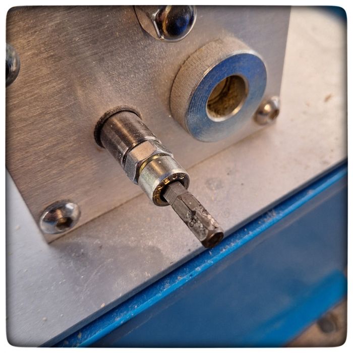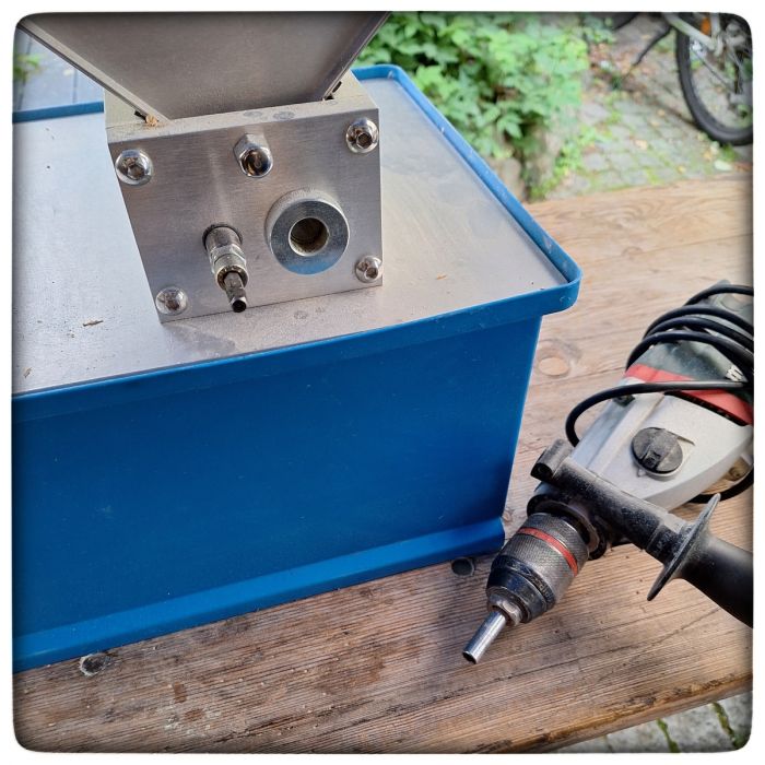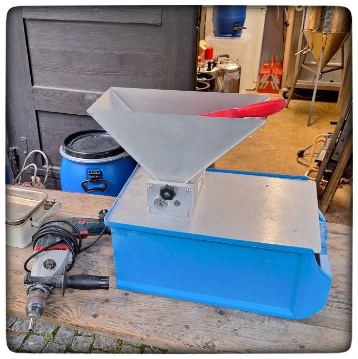 Ist das Malz gewogen, wird es geschrotet. Man kann sich Malz bereits geschrotet besorgen oder selbst schroten. Wir schroten selbst. Mit einer Handmühle. Weil das mit der Hand und der Kurbel, also mit der Handkurbel sowohl mühsam, kräftezehrend als auch zeitaufwändig ist, haben wir den Kreativmuskel spielen lassen und... eigentlich ganz einfach. Mittels Futter und Nuss wird einfach eine Bohrmaschine an die Welle der Mühle gedockt und auf geht's.