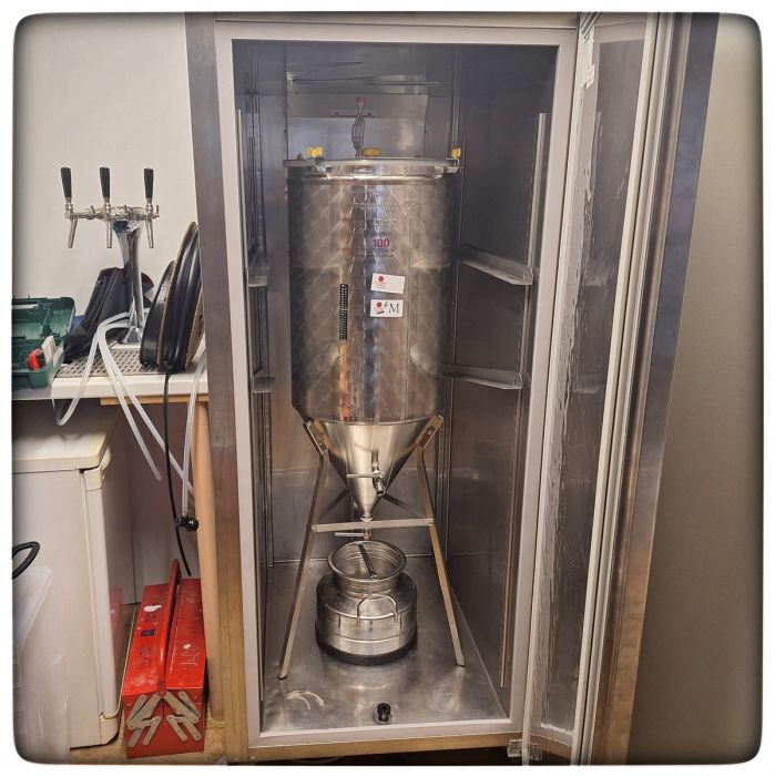 Am Ende des Tages stehen, sagen wir mal 80 Liter im Kühlschrank. Im Kühlschrank weil untergärig. Kühlschrank zu. Feierabend.