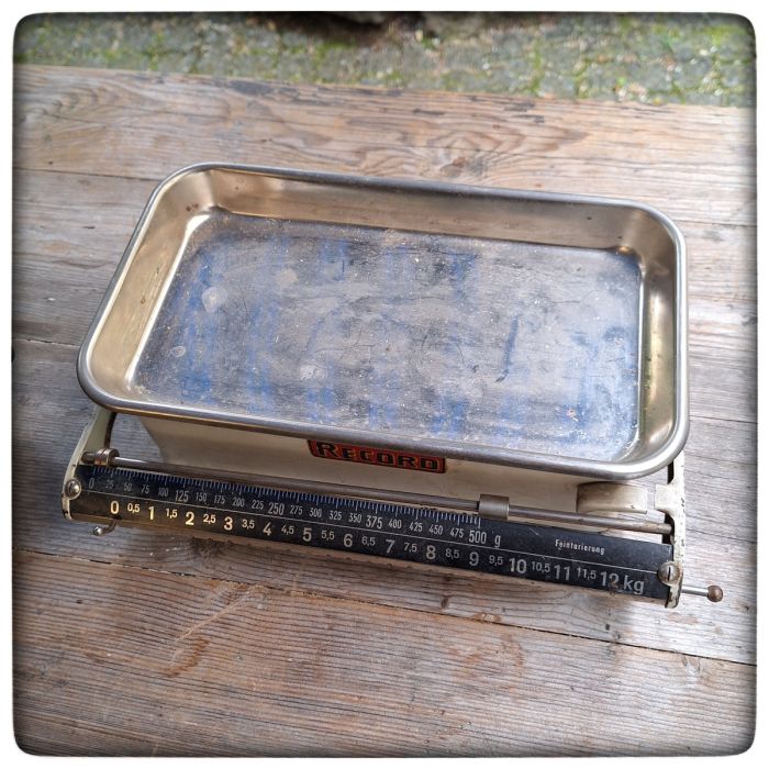 Um die rezeptgetreue Mischung des Malzes sicherstellen zu können, bedienen wir uns einer Waage. Nicht irgendeiner Waage, nein es ist eine Küchenwaage... auf der mögen die Augustiner Mönche schon experimentiert haben. Im Zeitalter der digitalen Anzeigendisplays mutet solch ein mechanisches Ungetüm hoffnungslos nostalgisch an. Und doch bin ich geneigt, mit Zähnen und Klauen gegen ein digitales Anzeigendisplay ins Felde zu ziehen.