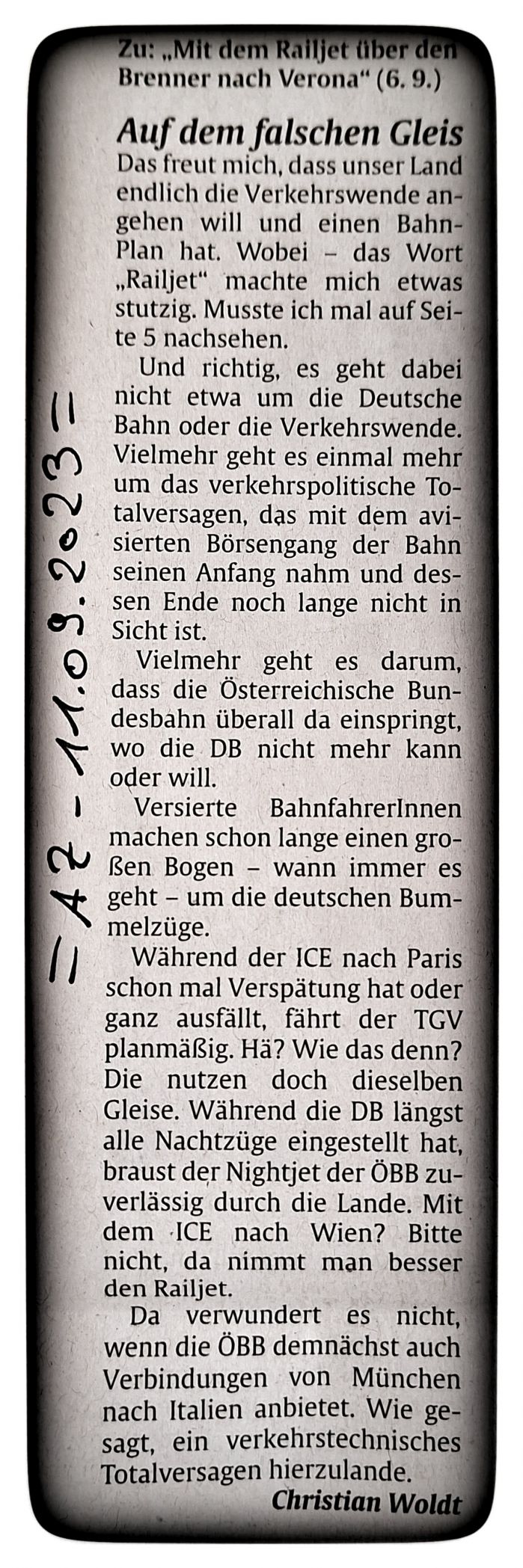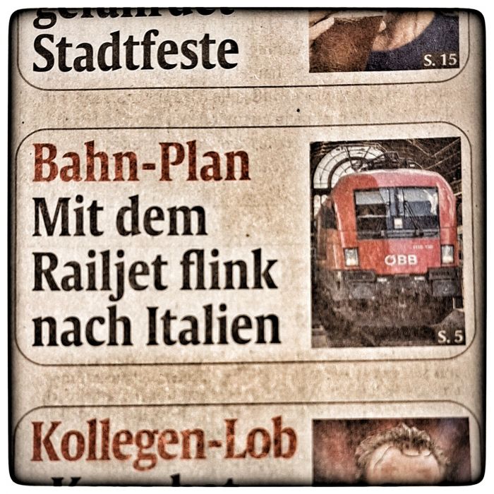 Der Bahn-Plan auf Seite 5Mit dem Railjet über den Brenner nach Verona.Das freut mich, dass unser Land endlich die Verkehrswende angehen will und einen Bahn-Plan hat.Wobei... das Wort "Railjet" macht mich etwas stutzig. Muss ich mal auf Seite 5 nachsehen.