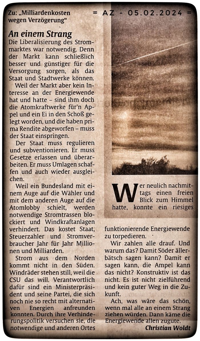Ach was wäre das schön, wenn mal alle an einem Strang ziehen würden. Dann käme die Energiewende allen zugute.