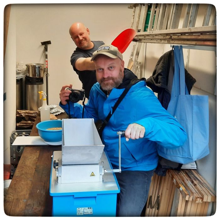 Wer 21 Kilo Malz per Hand schrotet, der weiß, warum die Hobbybrauer so dicke Oberarme haben. Wir waren zu dritt, das werden die Oberarme nicht ganz so dick.