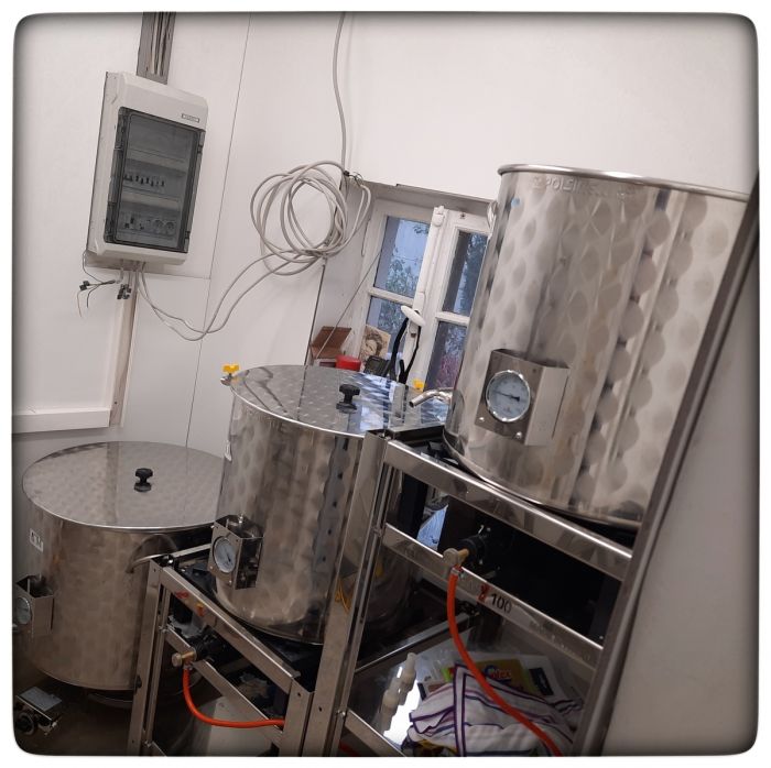 Und weil da gerade all die Töpfe im Bild sind, soll hier deren Funktion kurz erklärt werden: In dem Topf in der Mitte wird eingemaischt, die Rasten gemacht und geläutert. Der Topf rechts oben hält heisses Wasser für den Nachguss bereit. Im Topf links unten wird die Würze gekocht.