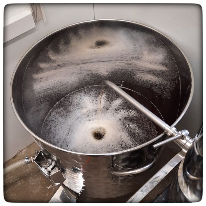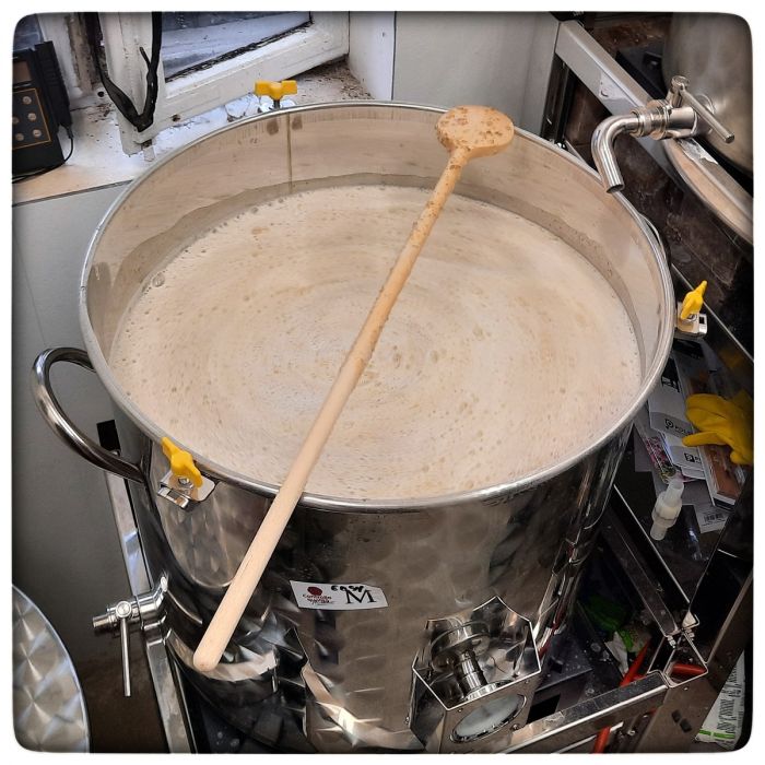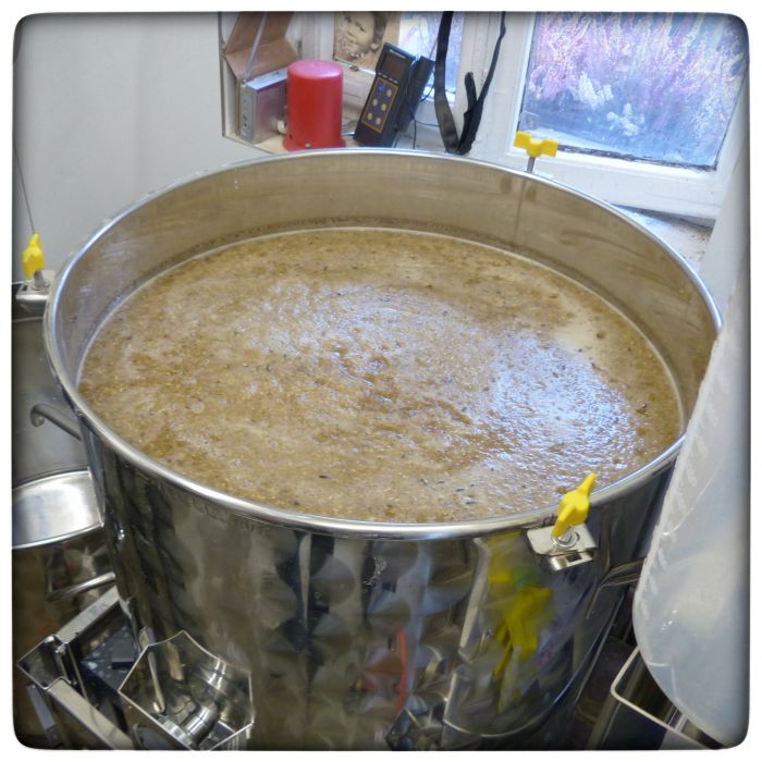 Hier rastet die Maische. Ich kann gerade nicht erkennen, bei wie viel Grad. Ist eigentlich auch egal, weil das auf einem Foto immer gleich aussieht. 50, 62 oder 72 Grad.