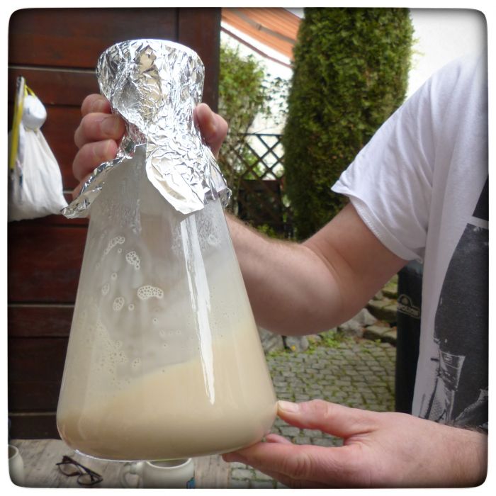 Und während die Vorwürze in den Kochtopf dröppelt möchten andere, wichtige Aufgaben erledigt werden. Zum Beispiel die Hefe. Wenn man Trockenhefe nimmt, dann muss die angerührt werden. Und angefüttert auch. Also erst das Hefepulver in Wasser auflösen und dann ein Gläschen Vorwürze dazu. Dann findet das die Hefe gut und fängt an zu arbeiten.
