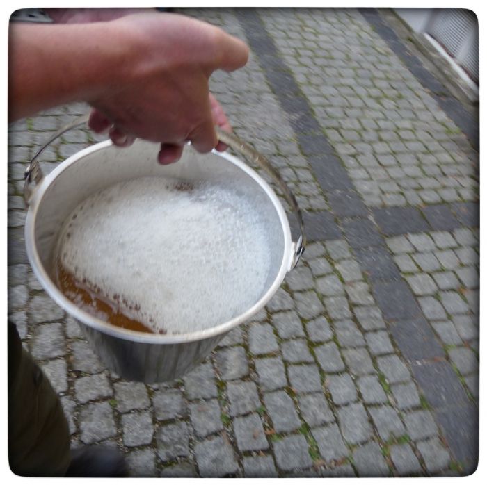 Jetzt ist der Brautag fast vorbei. Etwas muss allerdings noch erledigt werden. Die Würze muss ins Gärfass und da haben wir ganz klar noch etwas Optimierungsbedarf. Denn das Sudhaus ist ebenerdig, das Gärfass steht im Keller. Wegen der Temperatur. Bis uns denn was schlaues eingefallen ist, muss die Würze also per Eimer in den Keller.