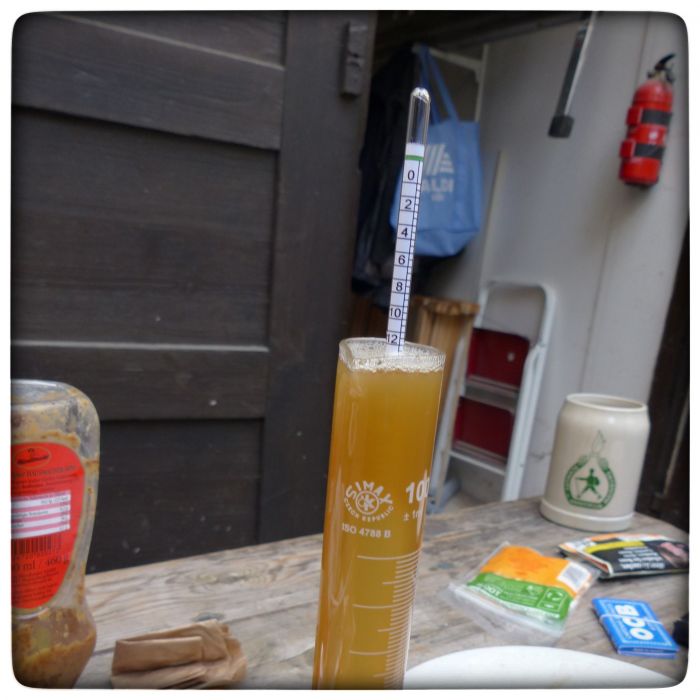 Während ich noch am Läuterpudding nasche, sind andere bereits wieder bei der Arbeit. Die Stammwürze möchte festgestellt werden. Aus der Stammwürze lässt sich dann der Alkoholgehalt des Bieres ermitteln. Da hätten wir also etwa 13 Grad Plato Stammwürze. Und dann rechnet man dann so: ...äh ja, da muss ich wohl noch einmal nachfragen gehen.