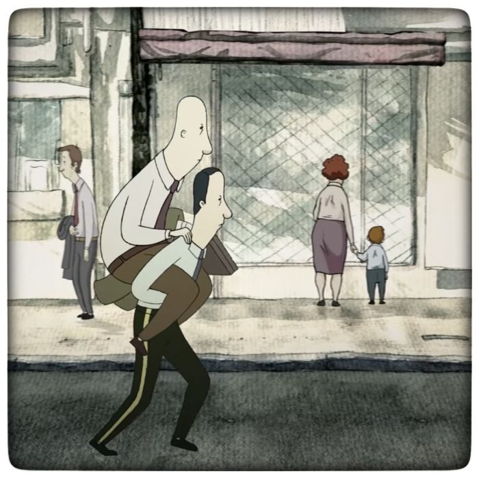 Der Protagonist wird durch seinen Tag begleitet. Den Weg zur Arbeit wird er huckepack getragen. Die Eingangstür besteht aus im Spalier stehenden Krawattenträgern.