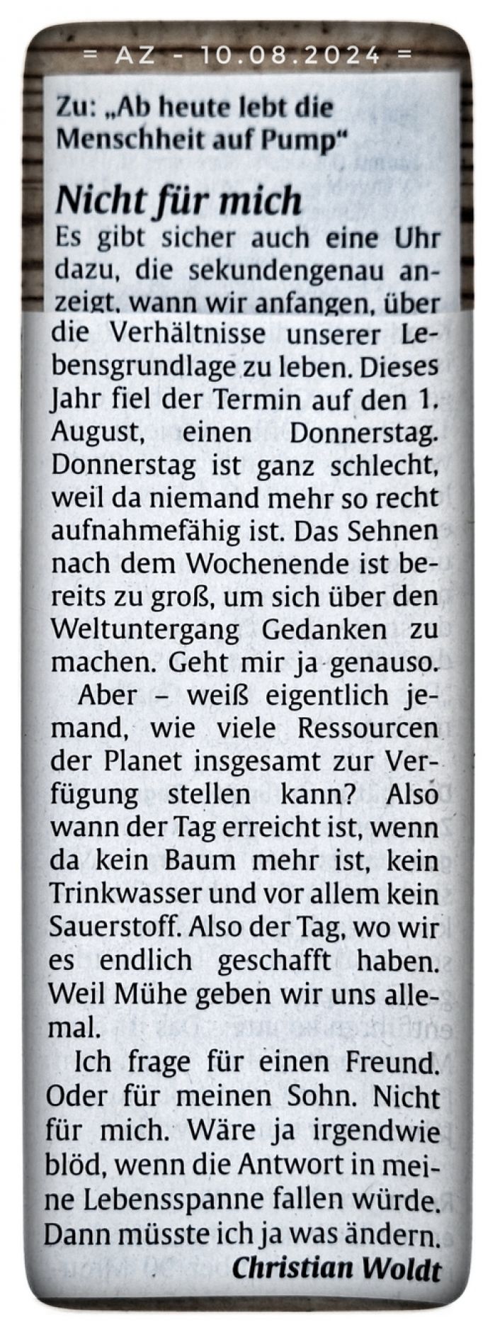 Das wird alljährlich zur Kenntnis genommen. Es ist in der Zeitung zu lesen und die Tagesschau berichtet. Im Internet steht das auch. Da gibt es sicher auch eine Uhr dazu, die sekundengenau anzeigt, wann wir anfangen über die Verhältnisse unserer Lebensgrundlage zu leben.