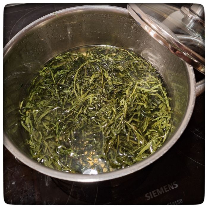 Der Estragon soll wenigstens drei Stunden abgedeckt ziehen. Dann den Sud abseien und Aufkochen. Heiss in eine (oder mehrere) saubere Flaschen mit Verschluß abfüllen.