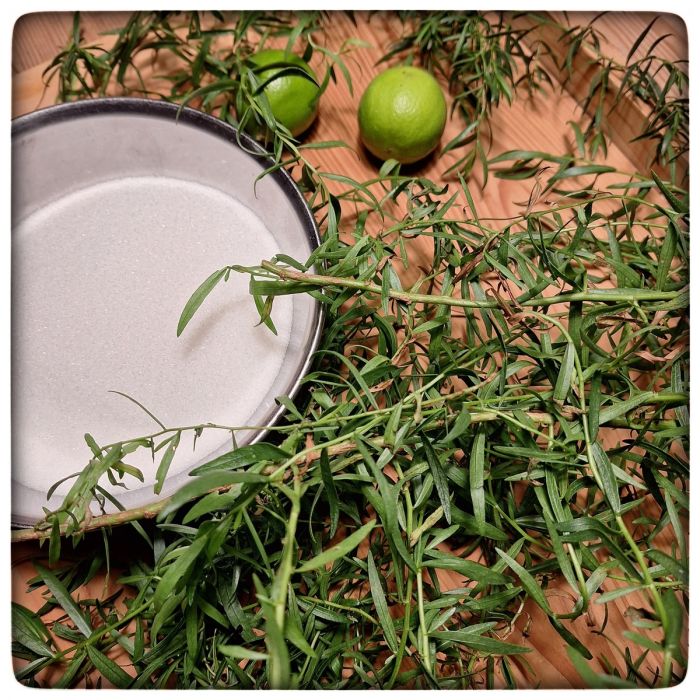 Sirup vielleicht? Das probiere ich mal aus. Aus dem Sirup wiederum sollen sich ja Wunderdinge machen lassen. Er soll sich eignen, um Süßspeisen und Salate aufzupeppen. Man kann ihn in Cocktails kippen... in welche, das weiß ich noch nicht. Und er ist Grundlage für... na... genau Estragon Limonade.