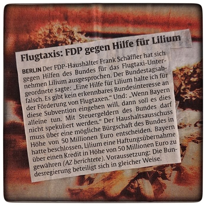 Es ist noch keine Woche her, da war zu vernehmen, dass der saubere Herr Verkehrsminister Volker Wissing Steuergelder in ein Flugtaxi stopfen will. Jetzt ist zu vernehmen, dass sein Parteigänger Frank Schäffler so gar nicht davon angetan ist.