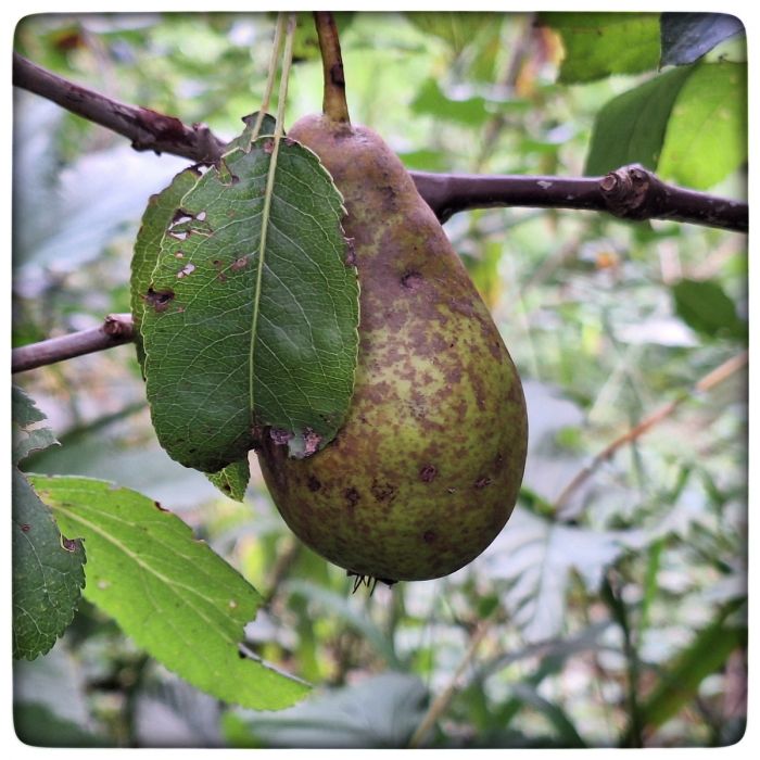 Hatte ich letztens gesagt, dass unsere Apfelernte einen mageren Obstkorb abgibt? Hey, ich habe nicht mit unserem Birnenbaum gerechnet. Da hängt glatt auch eine Frucht dran.