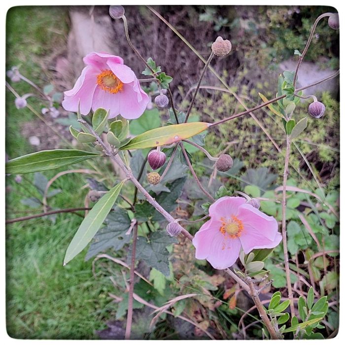 Spät im Jahr wird das die Bienen sicher freuen, die Herbstanemone und der Blutrote Stochschnabel nehmen ihre ganze Kraft zusammen und blühen um die Wette.