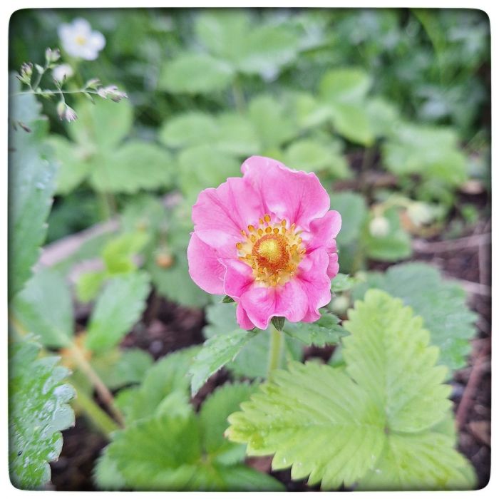 Habe ich schon einmal solch prächtige Blüten an einer Erdbeere gesehen? Habe ich nicht. Klein sind sie normalerweise. Und weiß. Nicht groß und Rosa. Wie wohl die Früchte aussehen? Ich werde es erleben. Ich werde berichten.