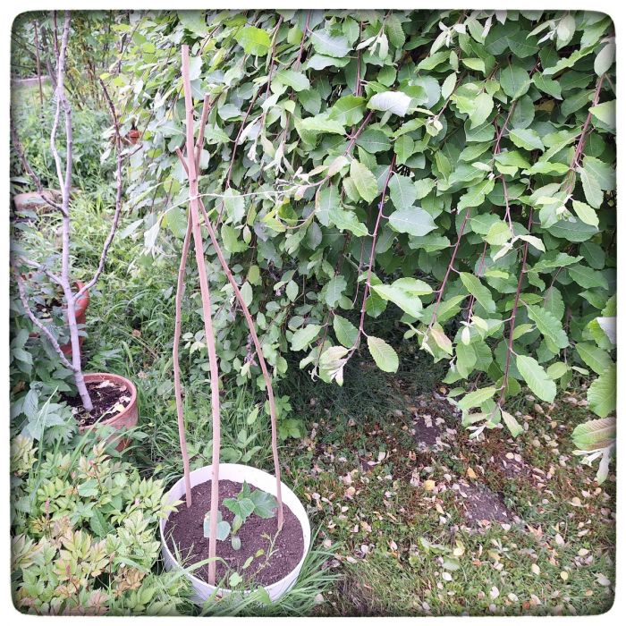 Ein Beet hat nur eine bestimmte Kapazität, um Gurken aufzunehmen. In diesem Fall liegt die Kapazität bei sechs Pflanzen. Da in unserem Gewächshaus jedoch wenigstens 10, wenn nicht 15 Samen ausgetrieben haben, ist Kreativität gefragt. Drei Zweiglein zu einer provisorischen Rankhilfe zusammen gedengelt, ich denke, damit bekomme ich die eine oder andere Pflanze unter.