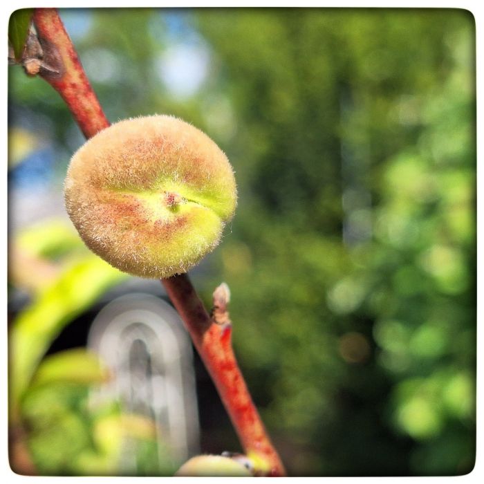 Der Pfirsichbaum hat geblüht und trägt Früchte. Das ist schön. Das ist Freud. Zumal ich mich an den vorzüglichen Geschmack der letztjährigen Ernte noch lebhaft erinnern kann.