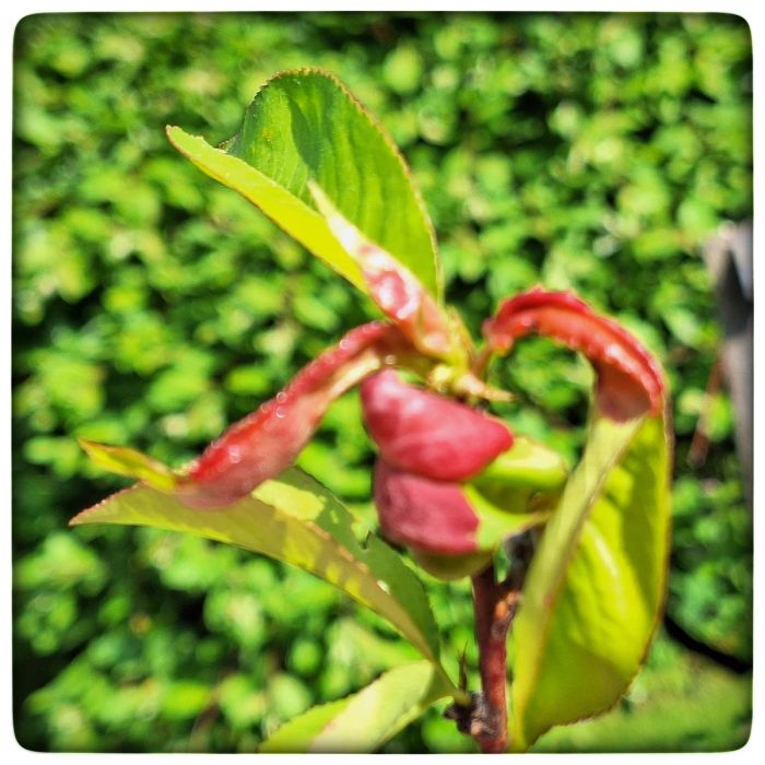 Ein paar Zweiglein weiter hat ihn die Kräuselkrankheit voll im Griff. Was man machen kann? Wenn sich die Blätter erst einmal kräuseln, dann ist es zu spät. Man kann die Blätter abknipsen. Das hält die Krankheit aber nicht auf. Also kann man sie auch dran lassen. Man liest davon, dass man einfach abwarten muss. Nach wenigen oder vielen Jahren verschwindet das Problem von selbst. Oder auch nicht. Man könne bei Zeiten auch dieses oder jenes auf die Zweige sprühen. Das aber bei Zeiten. Vielleicht erwische ich nächstes Jahr die richtige Zeit und sprühe dieses oder jenes auf die Zweiglein.