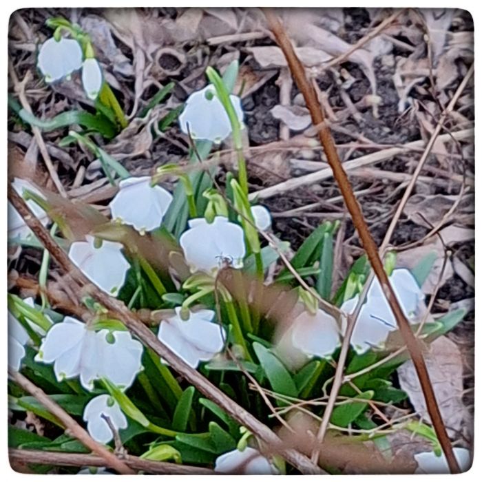 Dann gibt es diese größeren Schneeglöckchen. Die finde ich persönlich die hübscheren. Die haben einen fürchterlich profanen Namen. Frühlingsknotenblume nämlich. Das wird der Grazie und dem Anmut dieser filigranen Geschöpfe nicht gerecht. Darum nennen wir sie beim Spitznamen. Märzenbecher, das geht, das passt.