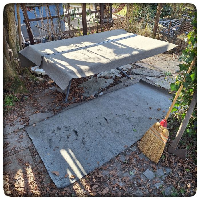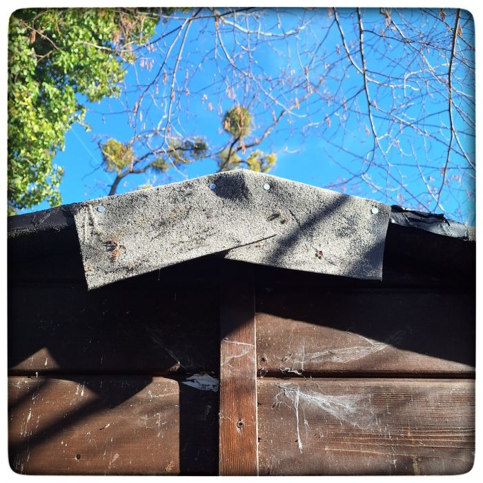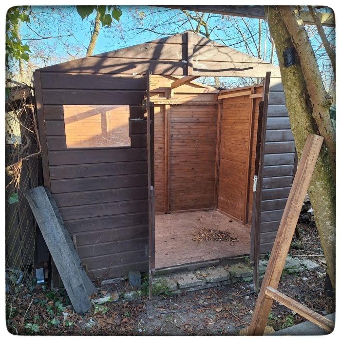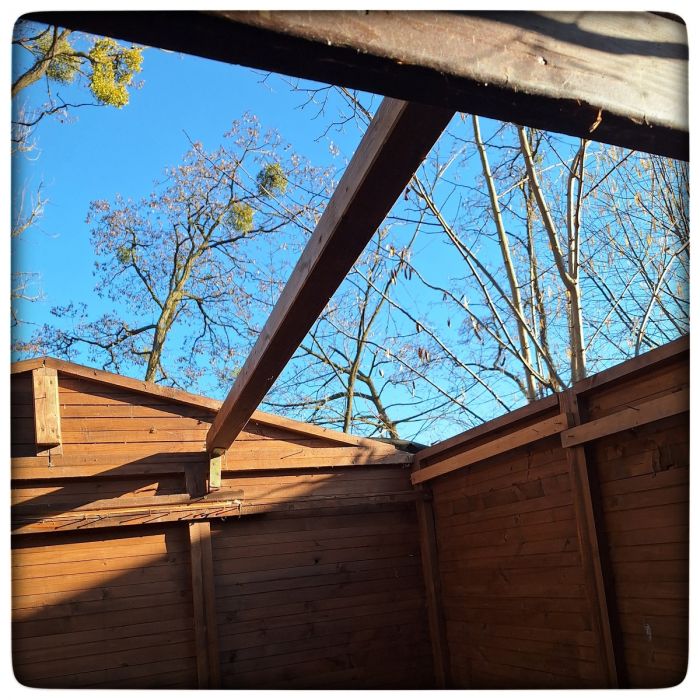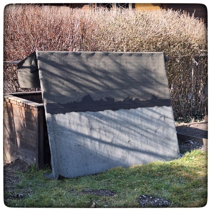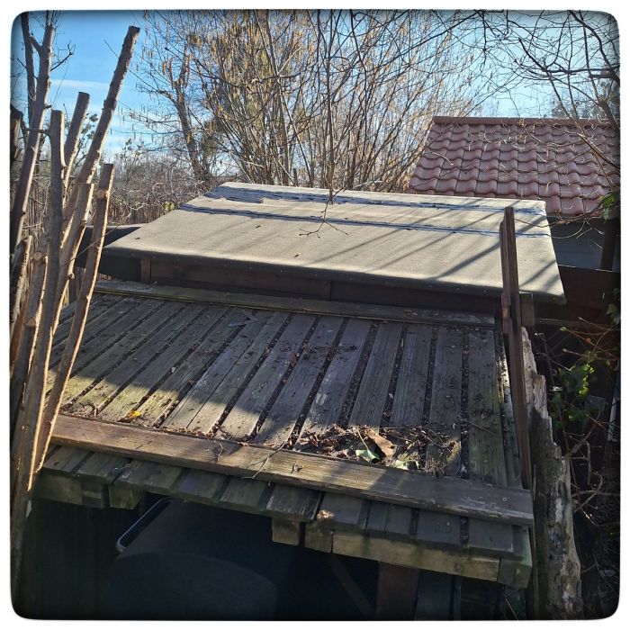 Es ist noch nicht lange her, dass der Wind den Schuppen abgedeckt hat. Dabei ist aufgefallen, dass das aus Sperrholz bestehende Dach völlig durchweicht und schimmlig ist. Oder war, so muss man sagen, denn das Dach ist Geschichte.