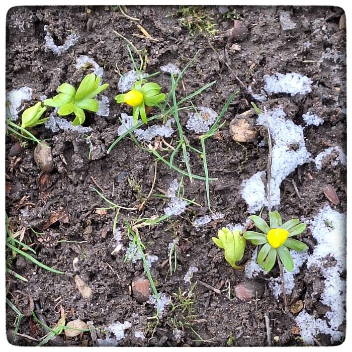 Farbe bringen auch diese kleinen gelben Gesellen. Ich glaube, die besuchen uns dieses Jahr zum ersten Mal. Und natürlich kannte ich ihren Namen nicht. Eine Kollegin half mir auf die Sprünge. Winterlinge seien das.