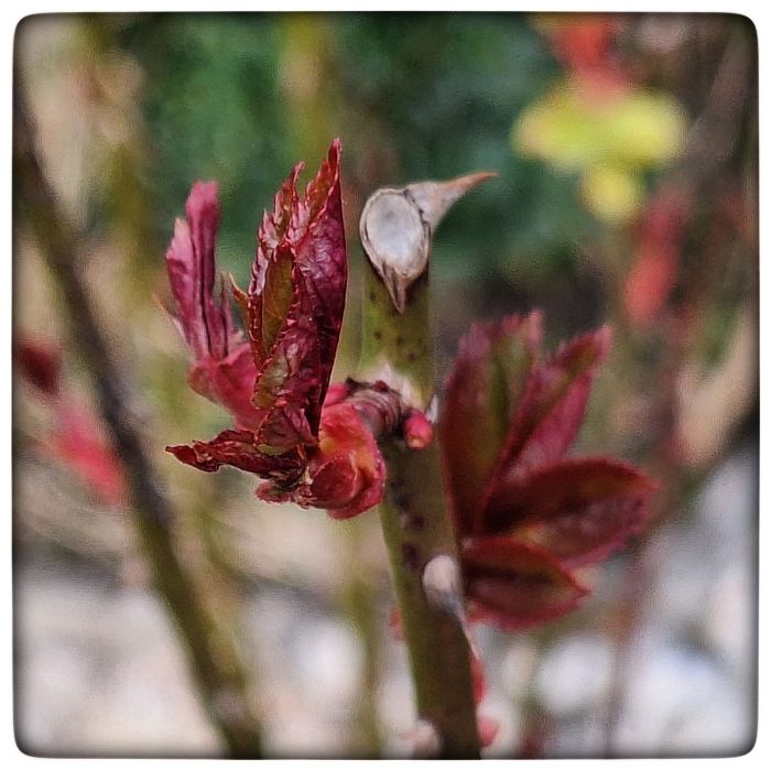 Rose, Blaugurke, Pfirsich. Alles schickt sich an frisches Grün der Sonne entgegen zu strecken. Wobei Grün jetzt relativ ist. Die Rose färbt ihre jungen Blätter den Blüten entsprechend erst mal rot.