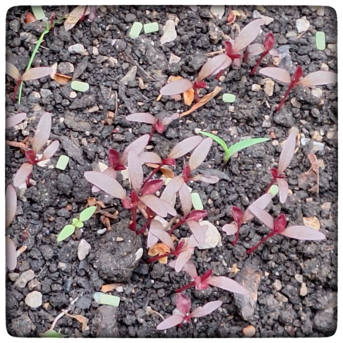 Was mich sehr freut, dass sind diese zarten, kleinen, roten Keimlinge. Fuchsschwanz ist das. Eine Amarant Art. Ob der essbar ist oder giftig, vermag ich nicht zu sagen. Schön anzusehen ist er allemal. Wenn er ausgewachsen ist. Bisher - also seit mehreren Jahren - sind all meine Versuche Fuchsschwanz auszusäen, fehl geschlagen. Entweder haben die Samen erst gar nicht gekeimt. Oder die Keimlinge sind direkt den Schnecken zum Opfer gefallen. Und die Schnecken waren gründlich.