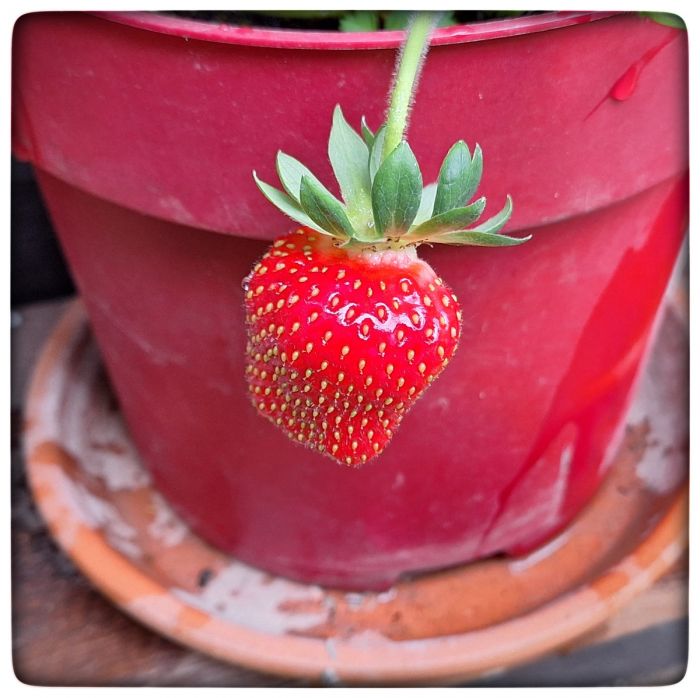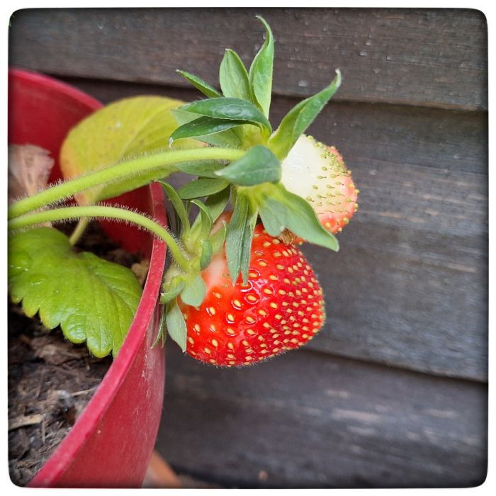 Die ersten Erdbeeren sind reif. Im Gewächshaus vorgezogen. Sollten nicht unter den Eisheiligen leiden. Jetzt erfreuen erste, feuerrote Früchte.