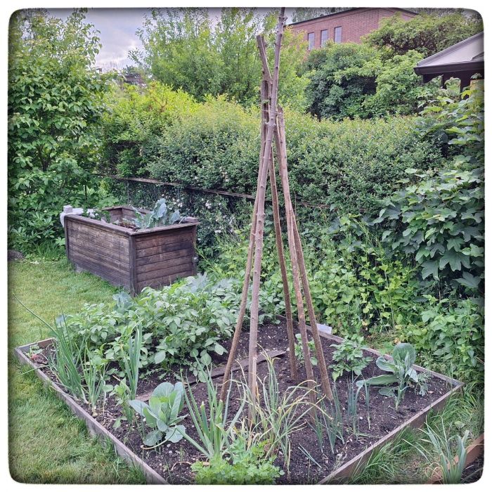 Für die Bohnen sieht das dann immer gleich aus: Stangen, die möglichst weit oben zusammen gebunden sind. Meist krumm und schief. Das macht den Bohnen gar nichts. Sie haben keine Augen. Und sie sind mit allem zufrieden, was ihnen auf ihrem Weg zu den Wolken dienlich ist.