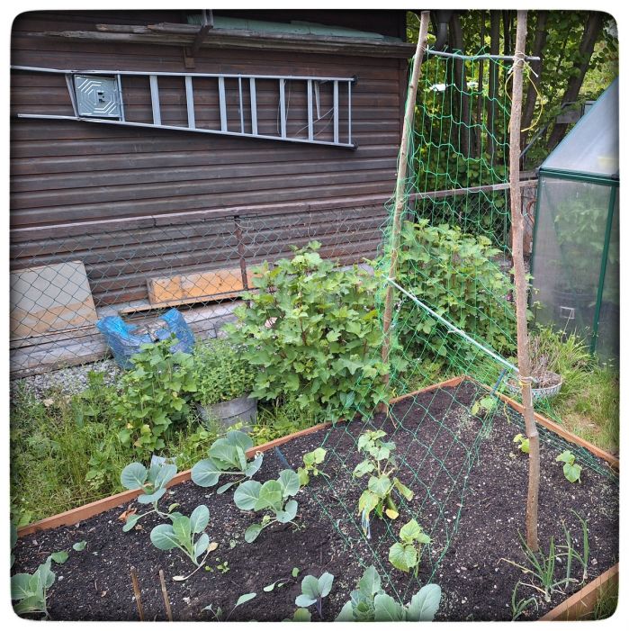 Für die Gurken? Der Plan ist, ihnen ein grobes Netz als Rankhilfe zu präsentieren, an dem sie sich nach belieben entfalten können. Wenn alles gut geht wachsen die Früchte durch das Netz und können bequem geerntet werden.
