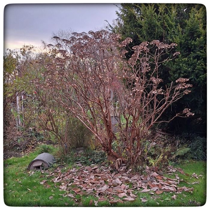 Die Hortensie wirft Jahr für Jahr alles von sich, was irgendwie nach Leben aussieht. Die Blüten, die Blätter und auch die Rinde, die unansehnlich in Fetzen vom Geäst hängt. Kaum zu glauben, dass diese dürren Zweige im nächsten Jahr wieder ein prächtiges Blätterkleid und beeindruckende Blüten zustande bringen.