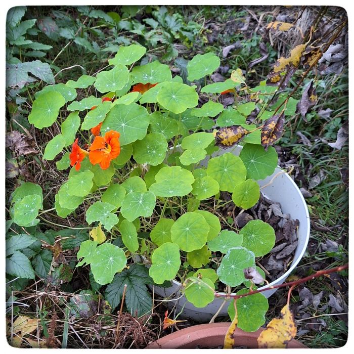 Zum Beispiel die Kapuzinerkresse. Weil die in erfrorenem Zustand aber gar so traurig aussieht, hier ein Bild aus besseren Tagen. Also von vor drei Wochen.