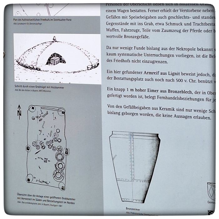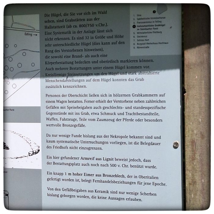 Unterwegs, weil man eben gerade da ist, ein bißchen Geschichte. Vor- und Frühgeschichte. Ein paar Jahrhunderte vor unserer Zeitrechnung. Da haben nämlich unterwegs auch schon Leute gelebt. Und vor allem sind sie gestorben und beerdigt worden. Und wo die beerdigt wurden, das kann man sehr schön sehen. Also auf einer Tafel, nicht in echt. In echt sind diese Gräber irgendwo im Dickicht unsichtbar und überwachsen.