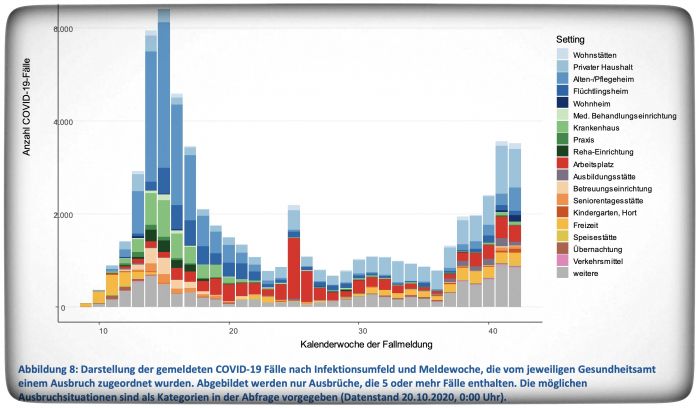 Nirgends? Jetzt endlich bin ich auf eine Grafik vom Robert Koch Institut gestossen, die das Infektionsumfeld von Beginn der Pandemie bis in den Oktober hinein skizziert. Grob, aber immerhin.