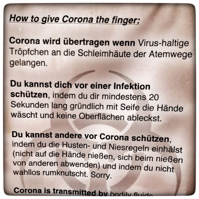 Nun ist der Virus wieder zurück in den Schlagzeilen. Weil er keinen Respekt vor Politik und Prominenz hat. Er befällt Präsidenten, Minister und Fußballer genau so, wie den Kollegen vom Nachbartisch. Und der Virus hat sich auf der Straße breit gemacht. Oder eben nicht auf der Straße. Vielleicht in den Kneipen und Kinos. Oder eben vielleicht auch nicht.