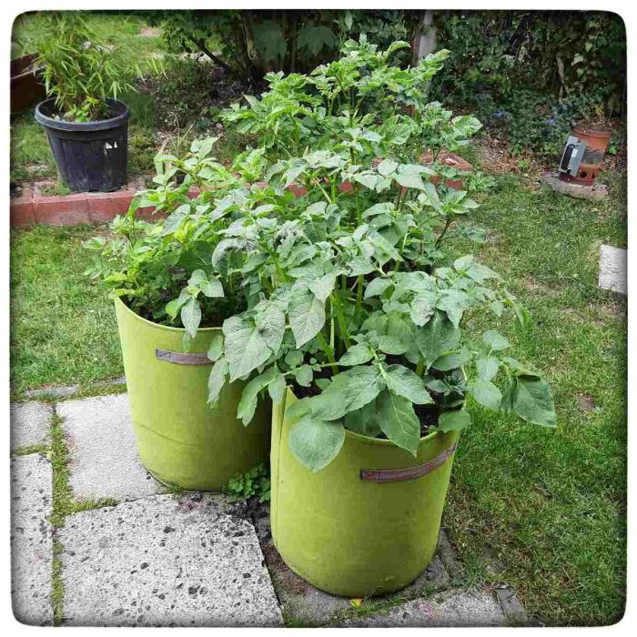Zumindest was das Wachstum oberirdisch angeht, sind die Säcke schon mal ein voller Erfolg. Selten so viel Kartoffelkraut im Garten gehabt. Ob die Ernte entsprechen üppig ausfallen wird? Ich werde berichten.