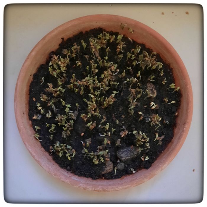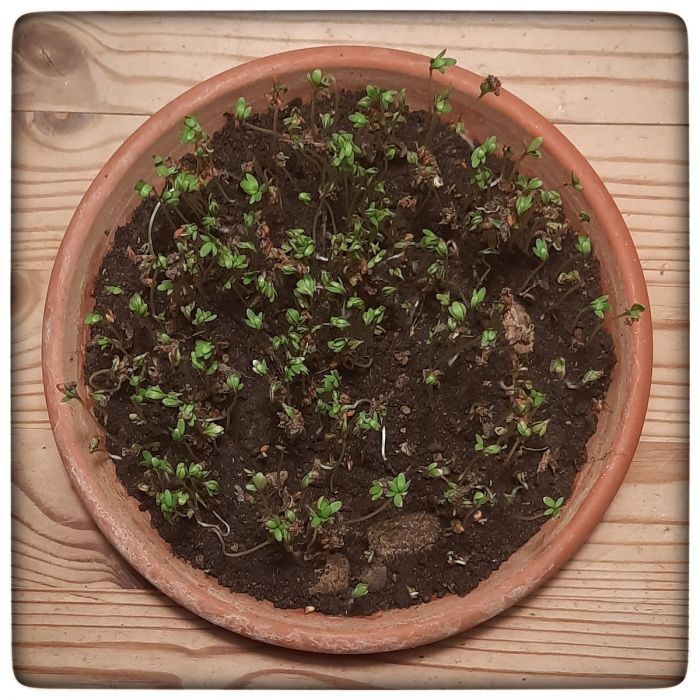 Um dieser Pein zu entrinnen, bin ich auf den Kressetest aufmerksam geworden. Einfach etwas Kressesamen auf den Kompost streuen und zusehen, was daraus wird.