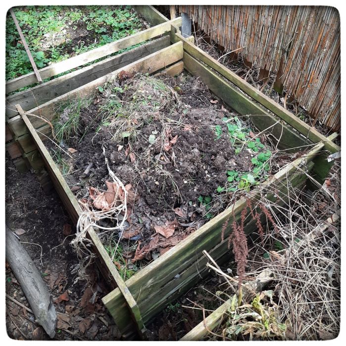 Was der gärtnernde Stadtmensch aber noch weiß, in so einem Garten fallen jede Menge Gartenabfälle an. Und weil im Garten keine Biotonne steht und es nicht so gerne gesehen wird, wenn der Heckenschnitt im Stadtbach landet, gehört zu einem Garten auch ein Komposthaufen. Gerne in ein Holzgatter eingepfercht, damit er nicht ausufert.