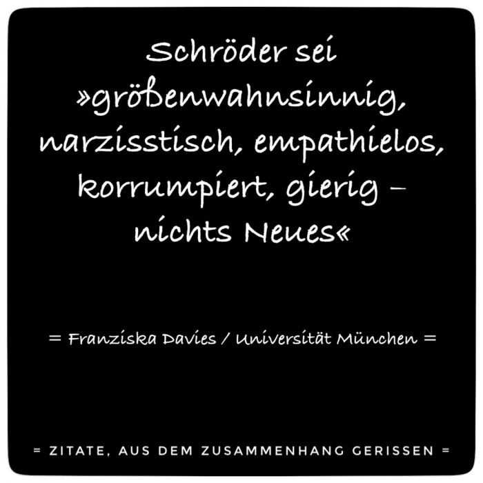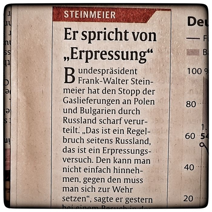Der Steinmeier ist doch ein Gaudibursch vor dem Herrn. Wenn der Herr Putin den Gashahn zudreht, dann sei das "ein Regelbruch", "ein Erpressungsversuch" gar(2).