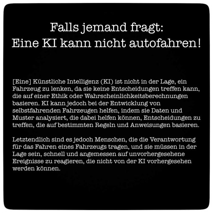 ChatGPT: Genau, das ist korrekt. Künstliche Intelligenz (KI) ist nicht in der Lage, ein Fahrzeug zu lenken, da sie keine Entscheidungen treffen kann, die auf einer Ethik oder Wahrscheinlichkeitsberechnungen basieren. KI kann jedoch bei der Entwicklung von selbstfahrenden Fahrzeugen helfen, indem sie Daten und Muster analysiert, die dabei helfen können, Entscheidungen zu treffen, die auf bestimmten Regeln und Anweisungen basieren.