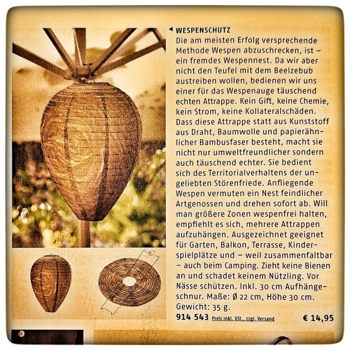 Nicht schlecht gestaunt habe ich über das Wespenschutzangebot eines irgendwie alternativ esoterischen Versandhändlers. Ein Wespenschutz in Form eines Lampions soll die lästigen Plagegeister Erfolg versprechend von Zwetschgendatschi und Radlermaß fern halten.