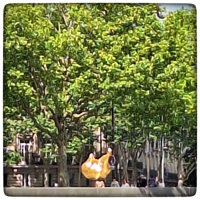 Am Ufer steht etwas unspektakulär, dafür Gold glänzend eine Replik der Freiheitsflamme der Freiheitsstatue. Vielleicht steht da auch bald das Original daneben, wenn es in den USA Essig mit der Freiheit ist. Wer vermag das schon zu sagen.