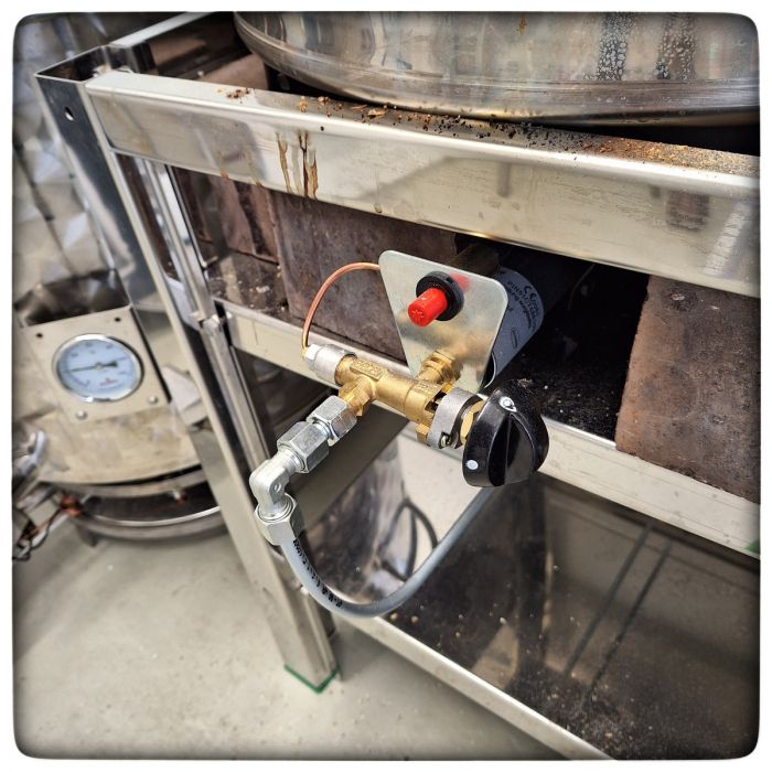 Die Gasanschlüsse der Polsinelli Brenner passen nicht zu den handelsüblichen Schlauchsystemen aus Baumarkt uns Fachhandel hierzulande. Wir haben entsprechend einen Schlauch genommen und im wörtlichen Sinne aufgebohrt, damit er an die Polsinelli Düsen passt. Dann mit einer Schlauchschelle festgeschraubt.