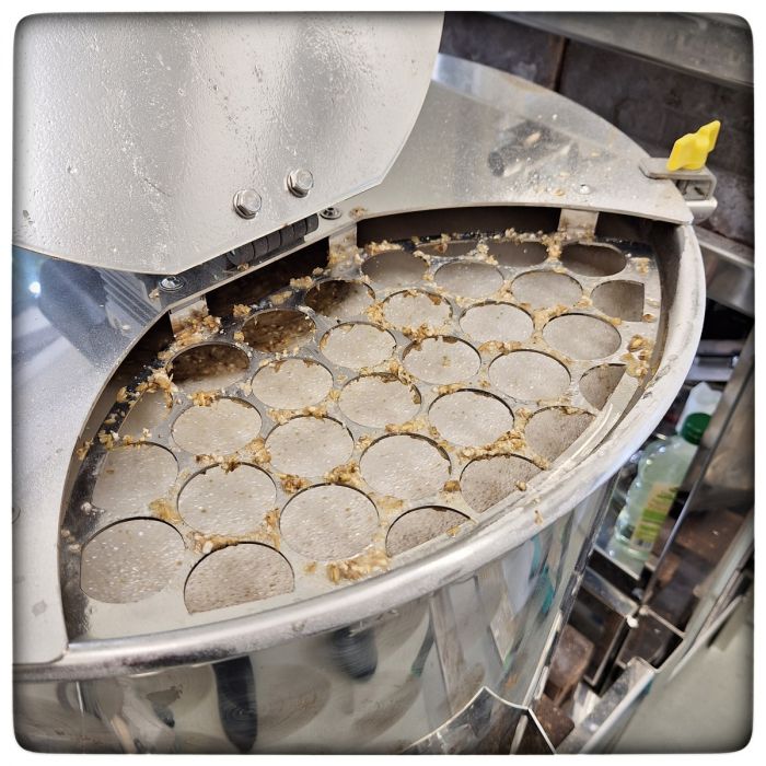 Am Rührwerk hat Polsinelli ein Lochblech angebracht. Hm, ja, kann man machen. Wir haben uns mehrfach gefragt: Warum jetzt? Das ist ja gleich so was von unpraktisch.